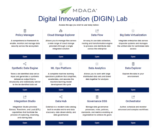 MDACA DIGIN is a cost effective, big data lab platform leveraging cloud adjacent technologies with a rapid environment stand up/tear down for developers to innovate and research proofs of concept securely through the AWS cloud interface. As an approved platform utilized by several U.S. Government clients, MDACA DIGIN provides a cost efficient, external environment to explore cloud native and other technologies where developers can access and share data over a private, secure interconnection without traversing the public internet.