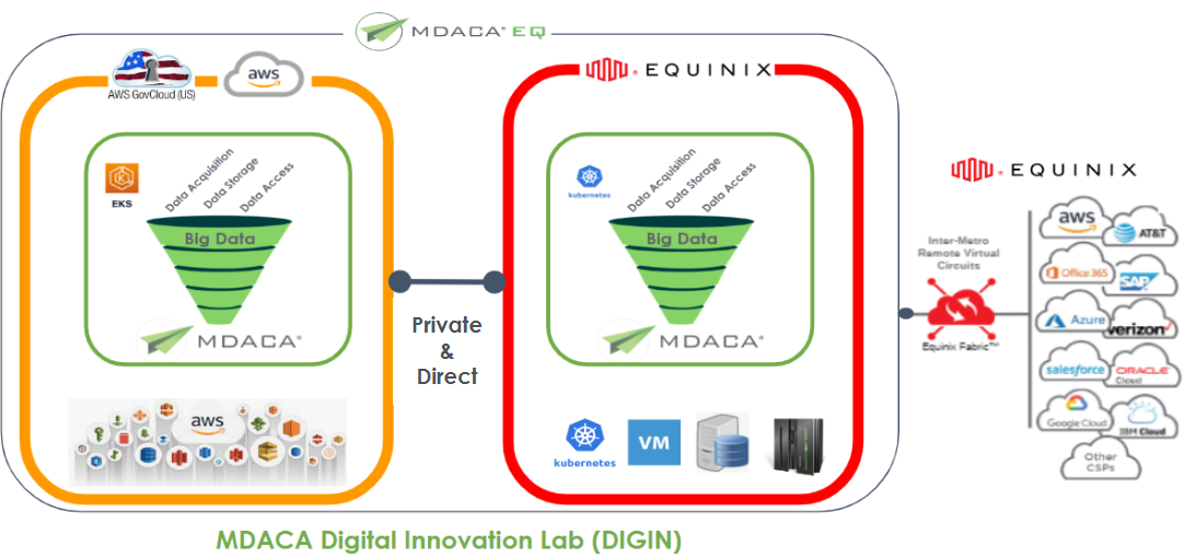 - High visibility and priority projects present the need to initiate execution with early discovery/development to meet critical timelines. The MDACA DIGIN supports these initiatives within a less constrained environment leveraging the AWS cloud and Equinix cloud adjacency.